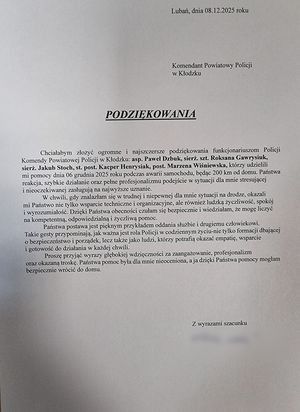 Komenda Powiatowa Policji w Kłodzku informuje, że do komendanta powiatowego wpłynęły podziękowania od kobiety, która otrzymała pomoc w trudnej sytuacji drogowej. Autorka listu wyróżniła profesjonalizm oraz wyjątkowe zaangażowanie funkcjonariuszy.